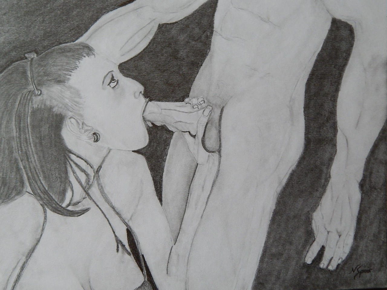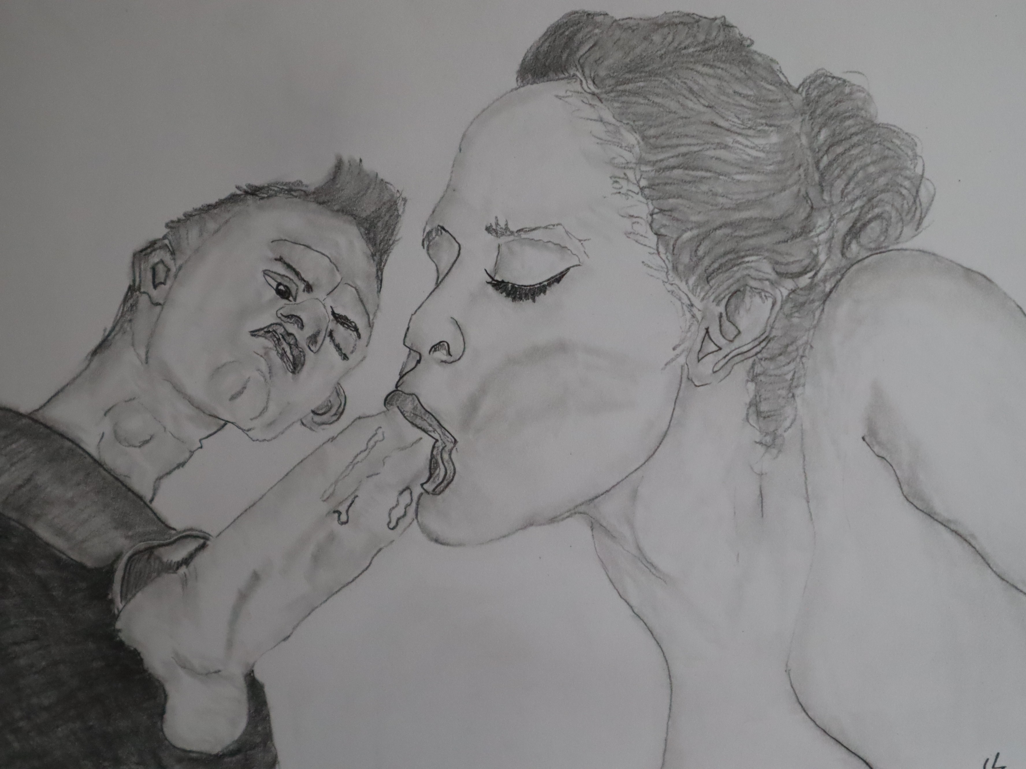 Her intense gaze as she pleasures her male counterpart.